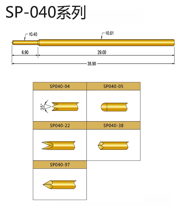 1、SP040探針的針身直徑是0.61mm,總長:35.90mm,頭部直徑0.40mm,額定電流:2A,接觸電阻:30毫歐姆,接觸彈力是80gf,適用于多種測試環(huán)境。