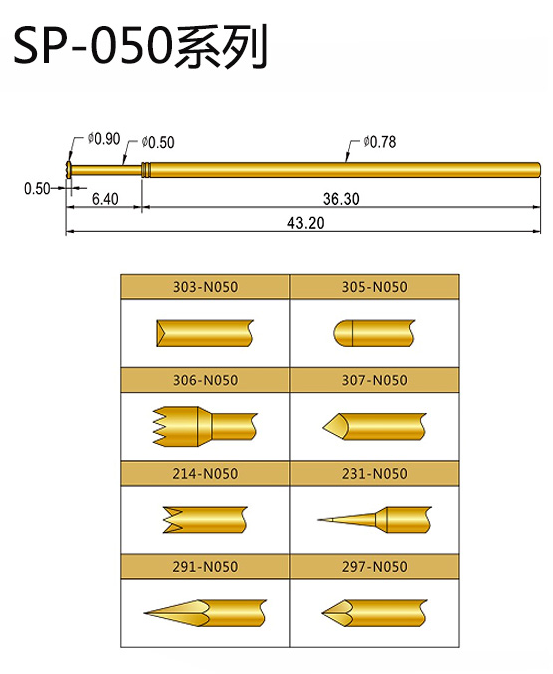 2、SP050探針的針身直徑:0.78mm,總長:43.2mm,有多種頭型,例如:梅花頭、凹頭、尖頭、平頭等,額定電流:3A,接觸電阻:30毫歐姆,彈力分別有1N/2N/3N,使用于在線領域測試。