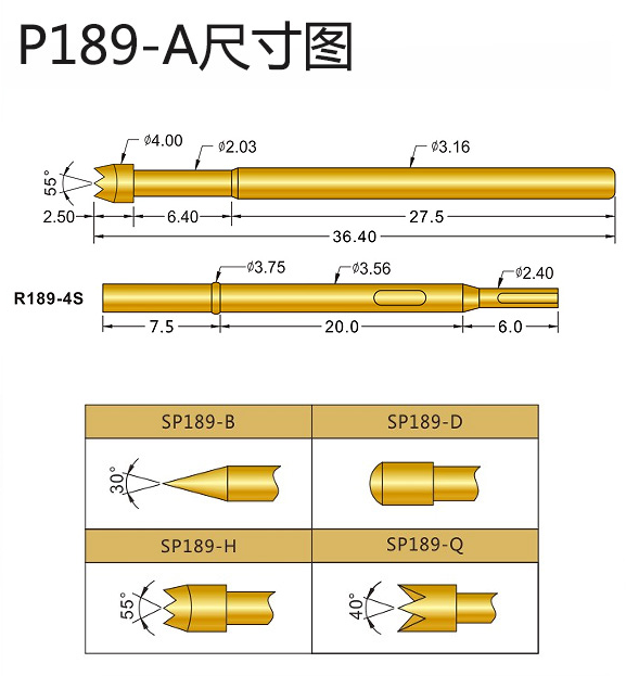9、SP189系列探針直徑:3.16mm,總長:36.40mm,針頭直徑:4.0mm,常用的配套是R189-4S,建議鉆孔尺寸:3.6mm。