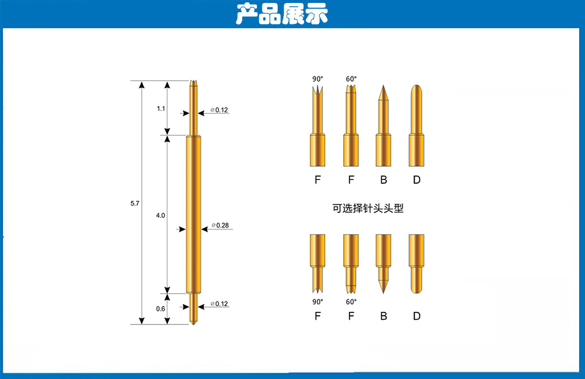 產(chǎn)品頭型:探針外徑為0.28mm,總長度為5.7mm、針的兩端的頭型分為圓頭、尖頭