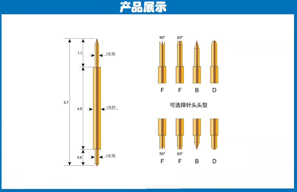 產(chǎn)品頭型:探針外徑為0.31mm,總長度為5.7mm、針的兩端的頭型均為尖頭、爪頭