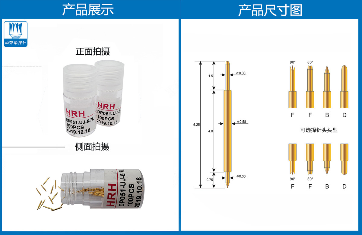 產(chǎn)品介紹:探針外徑為0.51mm,總長度為5.7mm、針的兩端的頭型為爪頭,圓頭