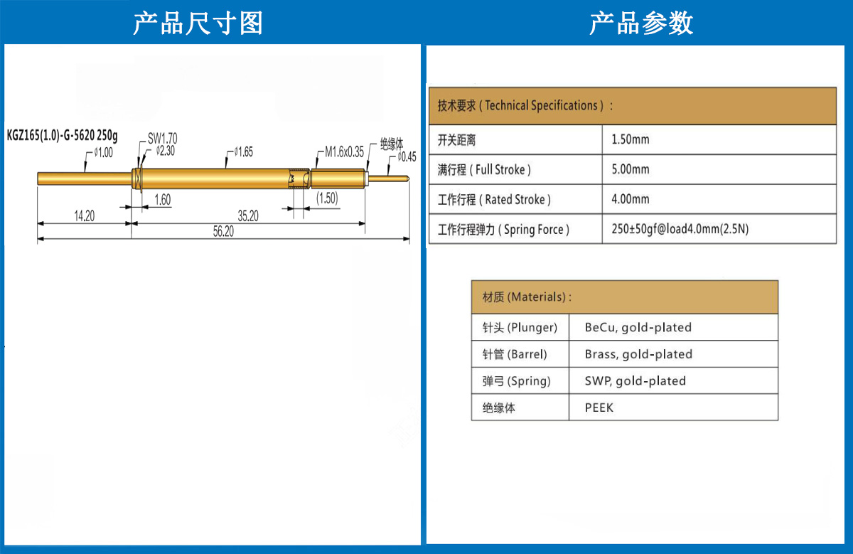 產(chǎn)品簡介:KGZ165探針、1.65mm測試針、總長56.20mm、彈簧針、測試針