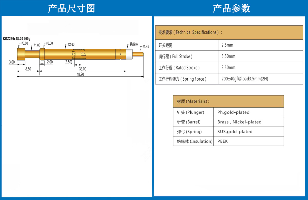 產(chǎn)品簡(jiǎn)介:KGZ260探針、2.60mm測(cè)試針、總長(zhǎng)48.20mm、彈簧針、測(cè)試針