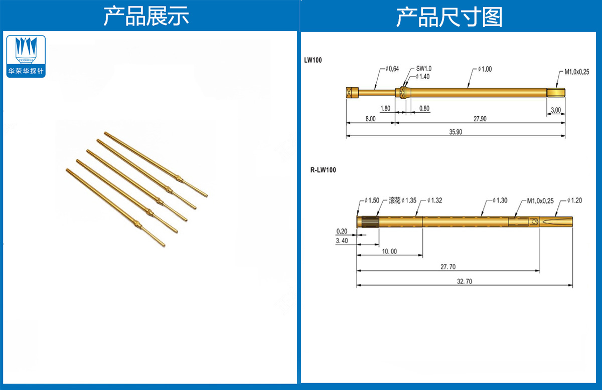 產(chǎn)品簡介:LW100線束探針、1.0mm測試針、總長35.90mm、彈簧針、頂針、探針